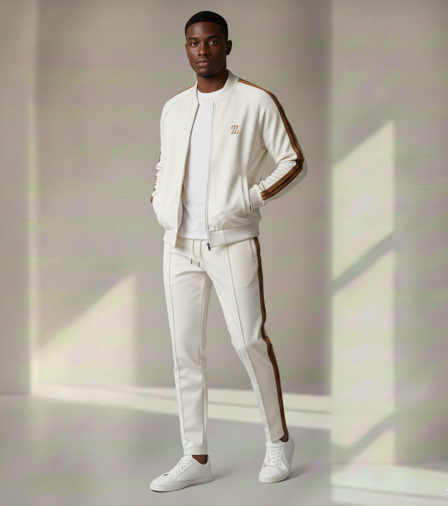 Die Jacke mit Reißverschluss passt perfekt zu der verstellbaren Hose mit Kordelzug – für einen entspannten, aber gepflegten Look. Das Ergebnis? Eine klare, selbstbewusste Silhouette, die Komfort und Stil auf elegante Weise verbindet.